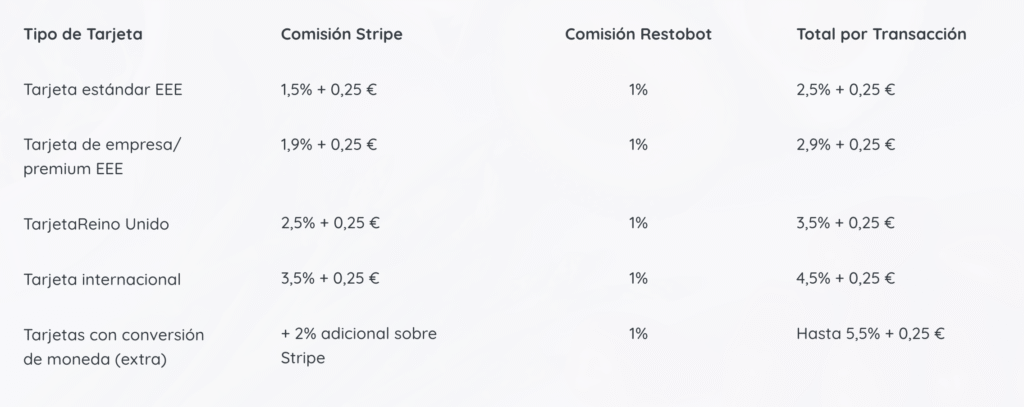 El sistema de pagos se basa en Stripe como plataforma de cobros. A continuación, se detallan las comisiones aplicables por tipo de tarjeta, así como el porcentaje que cobra Restobot por facilitar esta integración: